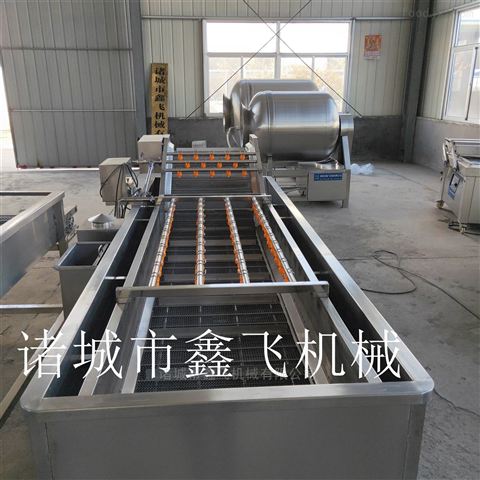 冷凍肉解凍機(jī)設(shè)備 主要應(yīng)用于肉類,禽類,海鮮、水果、蛋品、水果的解凍。將凍肉(板、塊)等料放進(jìn)加滿水的解凍池,用高壓氣泡將水快速翻騰,讓產(chǎn)品在解凍池內(nèi)相互碰撞,相互摩擦,從而達(dá)到快速解凍的目的。解凍池旁邊有恒溫池,水從恒溫池流入解凍機(jī)入料口處,隨著凍品的化冰解凍,網(wǎng)鏈上的產(chǎn)品向出料方向出料,解凍池內(nèi)的水溫慢慢下降,到出料這段時(shí)間,水再?gòu)慕鈨龀剡M(jìn)入到恒溫池,這樣循環(huán)利用,起到對(duì)水資源的節(jié)約,又能環(huán)保。既能降低成本,又能提高工作效率。